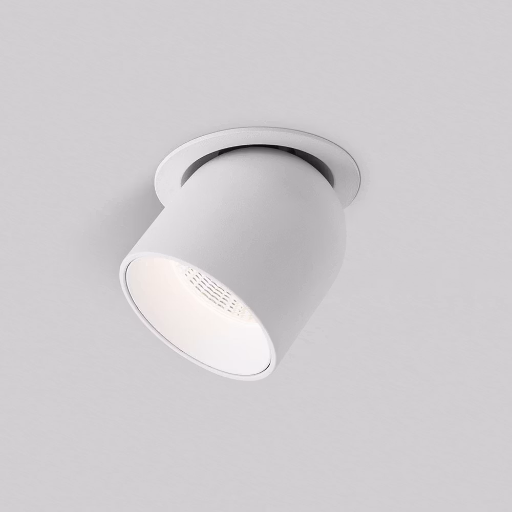 Takspotlight med en minimalistisk och modern design. Den är tillverkad i aluminium med en matt finish, vilket ger den ett rent och diskret utseende. Ljuskällan är infälld i en cylinderformad kropp och är riktbar, vilket gör att man kan justera ljusets riktning efter behov, perfekt för att belysa specifika ytor eller objekt.