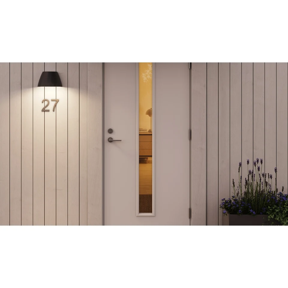 OUT-02 är en smart väggarmatur för utomhusbruk med tunable white och inbyggd LED, gjord för att lysa upp exempelvis fasader.