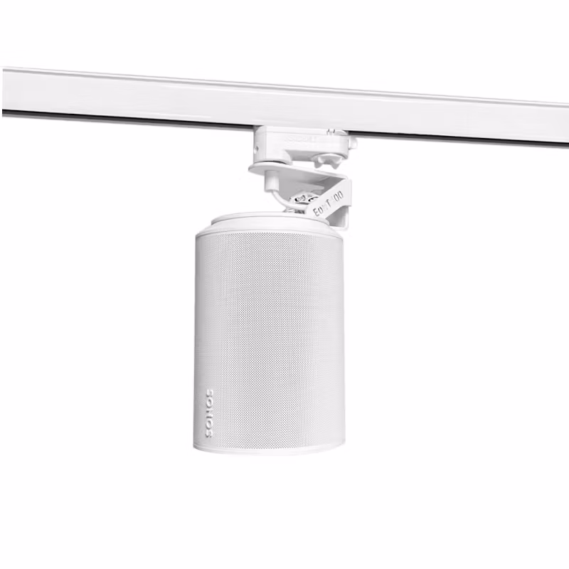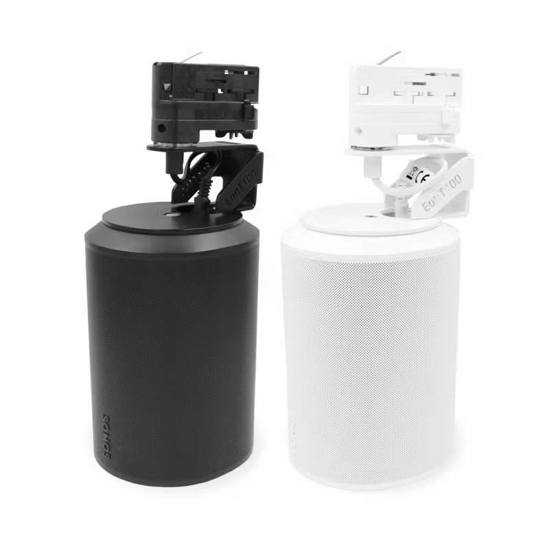 Högtalarfästet monteras på din Sonos Era 100 och ansluts direkt till din spotlightskena. Högtalaren drivs av skenans strömförsörjning, och med ett justerbart hjul på fästet väljer du vilken fas (strömbrytare) högtalaren ska vara kopplad till.