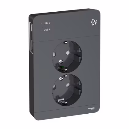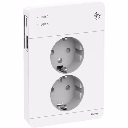 Schneider Exxact 2-vägs jordat vägguttag, 16A, med USB-A (max 2,4A) och USB-C (max 3A) laddningsportar. Orange lysdiod visar laddningsstatus. För infälld montering i apparatdosa c/c 60mm, utrustat med två neutrala överkopplingsklämmor. Dessutom är det petskyddat och utrustat med snabbanslutning för enkel installation.